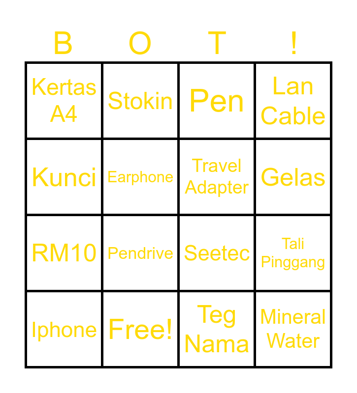 This bingo card has 16 words: Free!, Tali Pinggang, Pen, Kertas A4, RM10, Stokin, Seetec, Teg Nama, Kunci, Earphone, Iphone, Lan Cable, Pendrive, Gelas, Travel Adapter and Mineral Water.