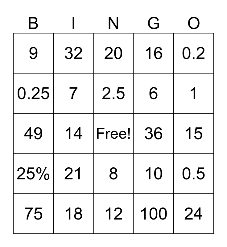 This bingo card has a free space and 24 words: 21, 18, 2.5, 75, 0.2, 9, 0.25, 32, 36, 8, 6, 49, 10, 0.5, 7, 100, 15, 20, 1, 14, 24, 25%, 16 and 12.