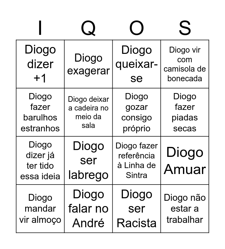 This bingo card has 16 words: Diogo falar no André, Diogo Amuar, Diogo queixar-se, Diogo dizer +1, Diogo dizer já ter tido essa ideia, Diogo exagerar, Diogo fazer referência à Linha de Sintra, Diogo ser Racista, Diogo fazer barulhos estranhos, Diogo deixar a cadeira no meio da sala, Diogo mandar vir almoço, Diogo vir com camisola de bonecada, Diogo ser labrego, Diogo fazer piadas secas, Diogo gozar consigo próprio and Diogo não estar a trabalhar.