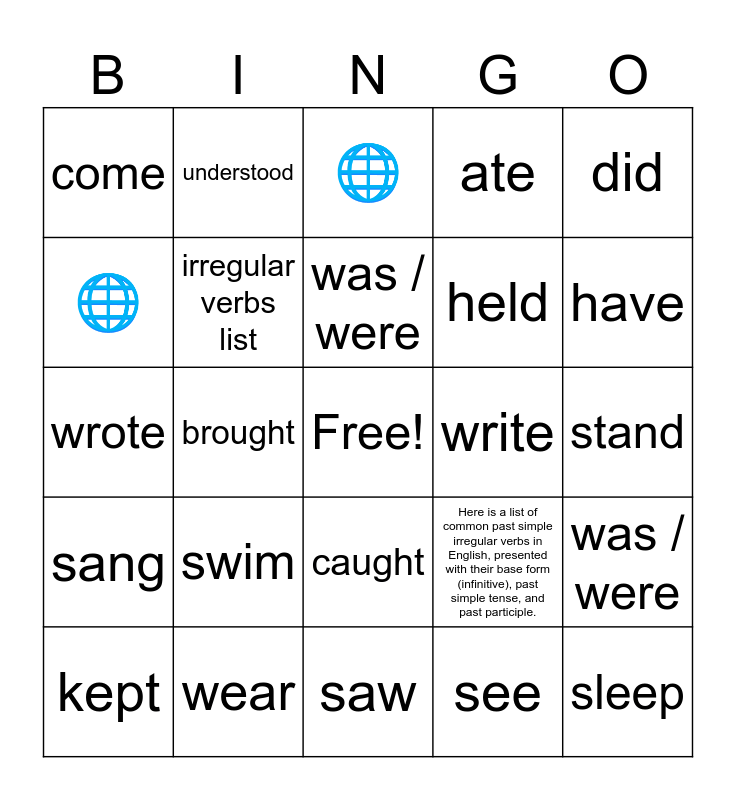 This bingo card has a free space and 162 words: Brave logo, Ask, All, Images, News, Videos, Goggles, list of past simple irregular verbs, Finished, 🌐, 🌐, 🌐, 🌐, +6, Here is a list of common past simple irregular verbs in English, presented with their base form (infinitive), past simple tense, and past participle., Common Irregular Verbs, Infinitive, be, become, begin, break, bring, build, buy, catch, choose, come, do, draw, drink, drive, eat, fall, feel, find, fly, forget, get, give, go, have, hear, hold, keep, know, leave, lend, lose, make, meet, pay, read, ride, run, say, see, sell, send, sing, sit, sleep, speak, stand, swim, take, teach, tell, think, understand, wear, win, write, irregular verbs list, 200 Most Important Irregular Verbs in English, english irregular verbs chart, Copy, list just the past simple, Finished, Here is a list of the past simple forms of common irregular verbs:, was / were, became, began, broke, brought, built, bought, caught, chose, came, did, drew, drank, drove, ate, fell, felt, found, flew, forgot, got, gave, went, had, heard, held, kept, knew, left, lent, lost, made, met, paid, put, read (/red/), rode, ran, said, saw, sold, sent, sang, sat, slept, spoke, stood, swam, took, taught, told, thought, understood, wore, won, wrote, irregular verbs past simple only, Copy, just the past simple, Finished, was / were, became, began, broke, brought, built, bought, caught, chose, came, did, drew, drank, drove, ate, fell, felt, found, flew, forgot, got, gave and went.