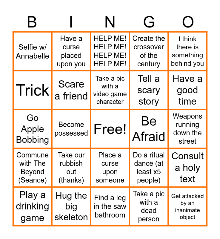 This bingo card has a free space and 34 words: Sleep in the coffin, Take a pic with a dead person, See a ghost, Take a Death Shot (find Max), Commune with The Beyond (Seance), Scare a friend, I think there is something behind you, Play a drinking game, Have a curse placed upon you, Take a pic with a movie character, Take a pic with a video game character, HELP ME! HELP ME! HELP ME! HELP ME!, Find a missing person, Take a pic with a Horror Icon, Be Afraid, Have a good time, Hug the big skeleton, Go Apple Bobbing, Take our rubbish out (thanks), Do a ritual dance (at least x5 people), Place a curse upon someone, “It’s alive!”, Selfie w/ Annabelle, Weapons running down the street, Find a leg in the saw bathroom, Get attacked by an inanimate object, Create the crossover of the century, Find the 8 pages, Tell a scary story, Trick, Treat, Become possessed, Consult a holy text and Family Guy death pose.