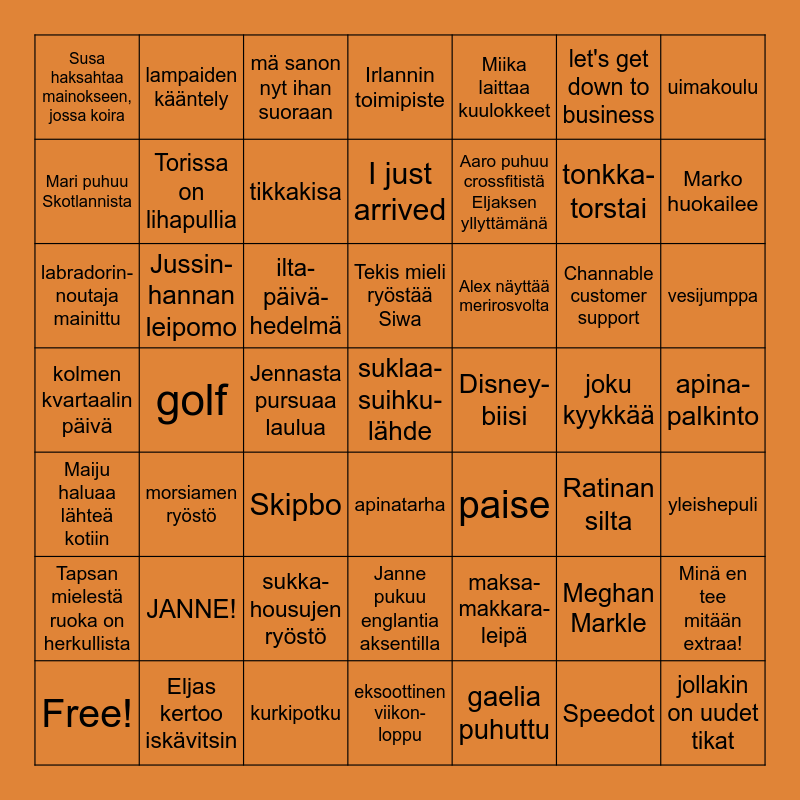 This bingo card has a free space and 51 words: Free!, tonkka-torstai, sushi- perjantai, golf, ilta- päivä- hedelmä, paise, lampaiden kääntely, gaelia puhuttu, let's get down to business, Ratinan silta, uimakoulu, Irlannin toimipiste, Channable customer support, Alex näyttää merirosvolta, Janne pukuu englantia aksentilla, Maiju haluaa lähteä kotiin, Mari puhuu Skotlannista, Marko huokailee, Eljas kertoo iskävitsin, Miika laittaa kuulokkeet, Aaro puhuu crossfitistä Eljaksen yllyttämänä, Jennasta pursuaa laulua, Susa haksahtaa mainokseen, jossa koira, Torissa on lihapullia, kurkipotku, jollakin on uudet tikat, tikkakisa, eksoottinen viikon- loppu, vesijumppa, mä sanon nyt ihan suoraan, tosissaan mutta ei totisesti, morsiamen ryöstö, sukka- housujen ryöstö, maksa- makkara- leipä, apinatarha, kolmen kvartaalin päivä, joku kyykkää, yleishepuli, Tapsan mielestä ruoka on herkullista, JANNE!, labradorin- noutaja mainittu, Jussin- hannan leipomo, Meghan Markle, Speedot, Disney-biisi, apina- palkinto, I just arrived, Skipbo, Minä en tee mitään extraa!, Tekis mieli ryöstää Siwa and Taylor Swift.