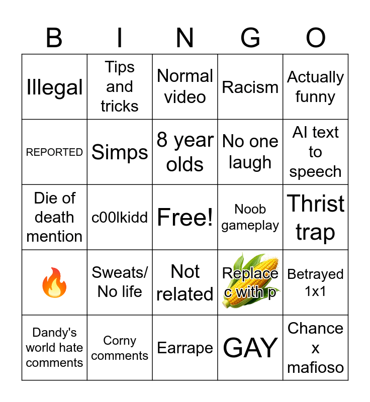 This bingo card has 1 images, a free space and 24 words: Sweats/ No life, Corny comments, 8 year olds, Dandy's world hate comments, Actually funny, Illegal, REPORTED, Tips and tricks, Noob gameplay, Not related, No one laugh, Die of death mention, Replace c with p, Betrayed 1x1, Simps, GAY, Thrist trap, Normal video, AI text to speech, c00lkidd, Chance x mafioso, 🔥, Racism and Earrape.