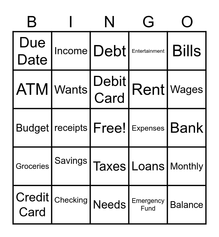 This bingo card has a free space and 24 words: Savings, Checking, Debit Card, Credit Card, Bills, Due Date, ATM, Income, Expenses, Taxes, Rent, Budget, Loans, Monthly, Wants, Emergency Fund, Bank, Debt, Wages, receipts, Balance, Groceries, Entertainment and Needs.