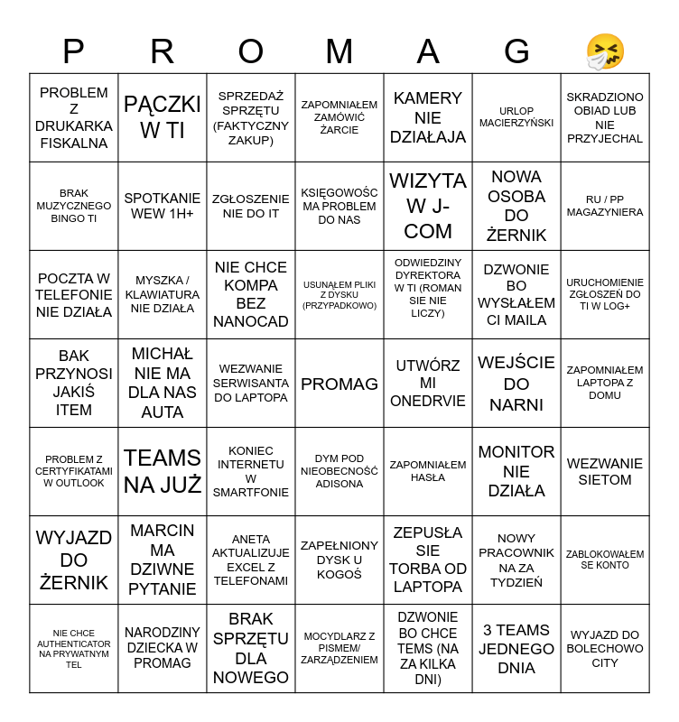 This bingo card has a free space and 48 words: ZEPUSŁA SIE TORBA OD LAPTOPA, NOWA OSOBA DO ŻERNIK, MOCYDLARZ Z PISMEM/ ZARZĄDZENIEM, MICHAŁ NIE MA DLA NAS AUTA, NIE CHCE KOMPA BEZ NANOCAD, ZAPOMNIAŁEM LAPTOPA Z DOMU, PĄCZKI W TI, NARODZINY DZIECKA W PROMAG, URLOP MACIERZYŃSKI, DYM POD NIEOBECNOŚĆ ADISONA, SKRADZIONO OBIAD LUB NIE PRZYJECHAL, ZAPOMNIAŁEM ZAMÓWIĆ ŻARCIE, DZWONIE BO WYSŁAŁEM CI MAILA, ODWIEDZINY DYREKTORA W TI (ROMAN SIE NIE LICZY), WYJAZD DO ŻERNIK, WEJŚCIE DO NARNI, BRAK MUZYCZNEGO BINGO TI, RU / PP MAGAZYNIERA, NOWY PRACOWNIK NA ZA TYDZIEŃ, KAMERY NIE DZIAŁAJA, WIZYTA W J-COM, WEZWANIE SERWISANTA DO LAPTOPA, PROBLEM Z DRUKARKA FISKALNA, SPOTKANIE WEW 1H+, ZABLOKOWAŁEM SE KONTO, ZGŁOSZENIE NIE DO IT, URUCHOMIENIE ZGŁOSZEŃ DO TI W LOG+, NIE CHCE AUTHENTICATOR NA PRYWATNYM TEL, USUNĄŁEM PLIKI Z DYSKU (PRZYPADKOWO), MYSZKA / KLAWIATURA NIE DZIAŁA, 3 TEAMS JEDNEGO DNIA, UTWÓRZ MI ONEDRVIE, WEZWANIE SIETOM, MARCIN MA DZIWNE PYTANIE, BAK PRZYNOSI JAKIŚ ITEM, ZAPOMNIAŁEM HASŁA, MONITOR NIE DZIAŁA, POCZTA W TELEFONIE NIE DZIAŁA, KONIEC INTERNETU W SMARTFONIE, ANETA AKTUALIZUJE EXCEL Z TELEFONAMI, PROBLEM Z CERTYFIKATAMI W OUTLOOK, WYJAZD DO BOLECHOWO CITY, SPRZEDAŻ SPRZĘTU (FAKTYCZNY ZAKUP), BRAK SPRZĘTU DLA NOWEGO, KSIĘGOWOŚC MA PROBLEM DO NAS, ZAPEŁNIONY DYSK U KOGOŚ, TEAMS NA JUŻ and DZWONIE BO CHCE TEMS (NA ZA KILKA DNI).