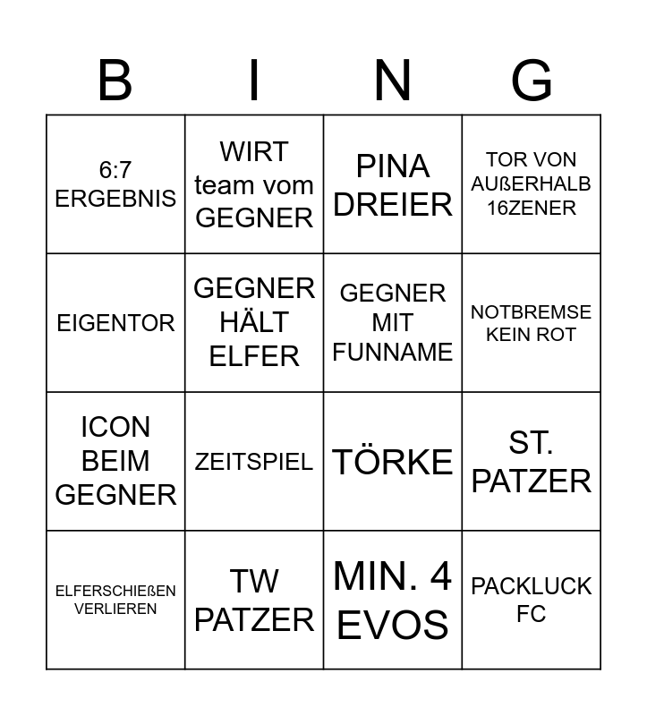 This bingo card has 16 words: TW PATZER, ST. PATZER, PINA DREIER, 6:7 ERGEBNIS, ICON BEIM GEGNER, WIRT team vom GEGNER, TÖRKE, MIN. 4 EVOS, EIGENTOR, GEGNER HÄLT ELFER, ELFERSCHIEßEN VERLIEREN, TOR VON AUßERHALB 16ZENER, ZEITSPIEL, NOTBREMSE KEIN ROT, GEGNER MIT FUNNAME and PACKLUCK FC.
