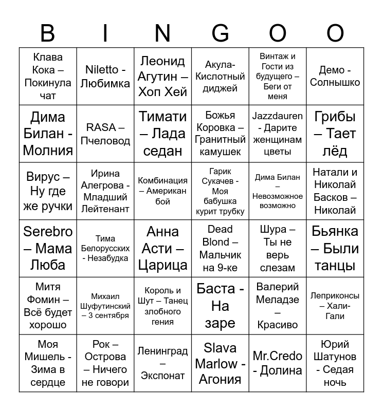 This bingo card has 52 words: Мурат Насыров – Мальчик хочет в Тамбов, Вирус – Ну где же ручки, Баста - Медлячок, Шура – Ты не верь слезам, Дима Билан – Невозможное возможно, Slava Marlow - Агония, Niletto - Любимка, Отпетые мошенники – Люби меня люби, Демо - Солнышко, Mr.Credo - Долина, Дима Билан - Молния, Рок – Острова – Ничего не говори, Тима Белорусских - Незабудка, Serebro – Мама Люба, Макан – Асфальт8, Моя Мишель - Зима в сердце, RASA – Пчеловод, Ирина Алегрова - Младший Лейтенант, Айдамир Мугу – Черные глаза, Винтаж и Гости из будущего – Беги от меня, Грибы – Тает лёд, Бьянка – Были танцы, Клава Кока – Покинула чат, Тимати – Лада седан, Максим – Знаешь ли ты, Митя Фомин – Всё будет хорошо, Баста - На заре, Федук и Элджей - Розовое вино, Божья Коровка – Гранитный камушек, Король и Шут – Танец злобного гения, Ария - УЛИЦА РОЗ, Акула- Кислотный диджей, Quest Pistols – Белая стрекоза любви, Город 312 - Фонари, Валерий Меладзе – Красиво, Леонид Агутин – Хоп Хей, Dead Blond – Мальчик на 9-ке, Ленинград – Экспонат, Юрий Шатунов - Седая ночь, Ирина Кайратовна - Айдахар, Андрей губин - Ночь, Комбинация – Американ бой, Гарик Сукачев - Моя бабушка курит трубку, На-На – Фаина, Натали и Николай Басков – Николай, Михаил Шуфутинский – 3 сентября, Леприконсы – Хали-Гали, Jazzdauren - Дарите женщинам цветы, GAYAZOV$ BROTHER$ - Малиновая лада, Сектор Газа – Туман, Анна Асти – Царица and Лолита - Титаник.