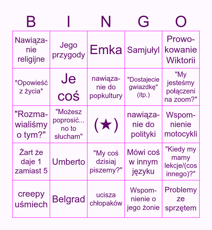 This bingo card has a free space and 24 words: creepy uśmiech, Umberto, nawiąza- nie do popkultury, Wspom- nienie o jego żonie, Prowo- kowanie Wiktorii, Nawiąza- nie religijne, Jego przygody, Emka, nawiąza- nie do polityki, Wspom- nienie motocykli, "Rozma- wialiśmy o tym?", Je coś, Mówi coś w innym języku, "Kiedy my mamy lekcje/(cos innego)?", *Opowieść z życia*, Belgrad, ucisza chłopaków, Samjułyl, "My jesteśmy połączeni na zoom?", Żart że daje 1 zamiast 5, "Możesz poprosić... no to słucham", "My coś dzisiaj piszemy?", "Dostajecie gwiazdkę" (itp.) and Problemy ze sprzętem.