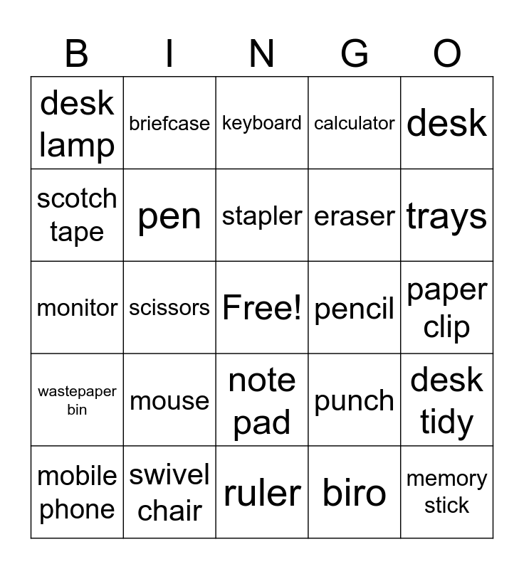 This bingo card has a free space and 24 words: mouse, swivel chair, stapler, mobile phone, desk, desk lamp, scotch tape, briefcase, pencil, note pad, eraser, monitor, punch, desk tidy, pen, biro, paper clip, keyboard, trays, scissors, memory stick, wastepaper bin, calculator and ruler.