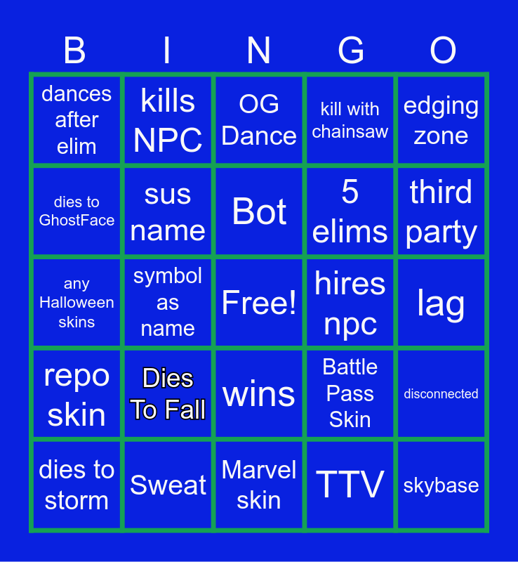 This bingo card has a free space and 24 words: Dies To Fall, Sweat, Bot, dies to storm, edging zone, dances after elim, dies to GhostFace, kills NPC, hires npc, wins, 5 elims, any Halloween skins, Battle Pass Skin, disconnected, sus name, TTV, lag, OG Dance, third party, symbol as name, skybase, repo skin, kill with chainsaw and Marvel skin.