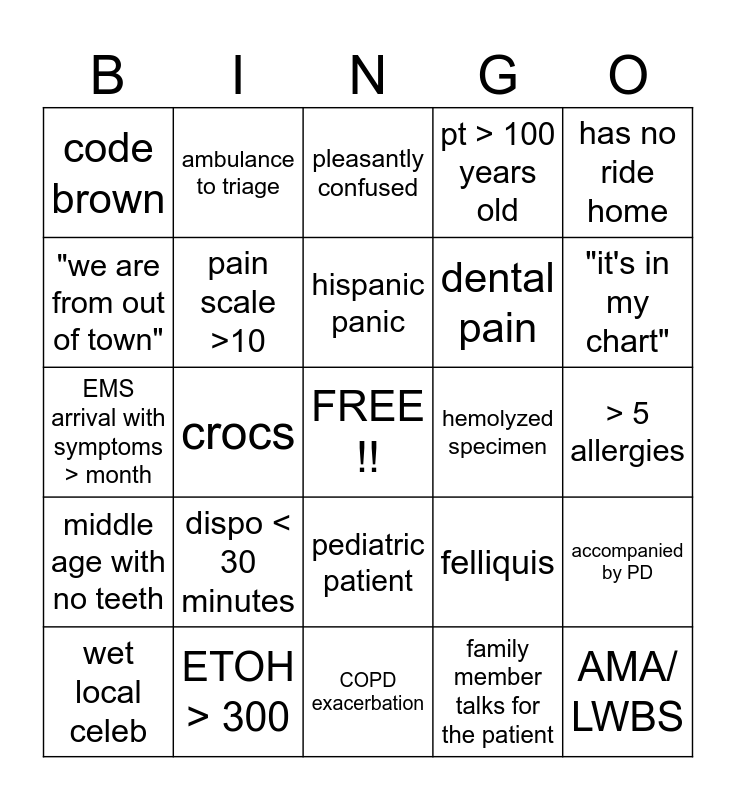 This bingo card has a free space and 24 words: dispo < 30 minutes, ETOH > 300, hispanic panic, wet local celeb, has no ride home, code brown, "we are from out of town", ambulance to triage, hemolyzed specimen, pediatric patient, dental pain, EMS arrival with symptoms > month, felliquis, accompanied by PD, pain scale >10, family member talks for the patient, > 5 allergies, pleasantly confused, "it's in my chart", crocs, AMA/ LWBS, middle age with no teeth, pt > 100 years old and COPD exacerbation.