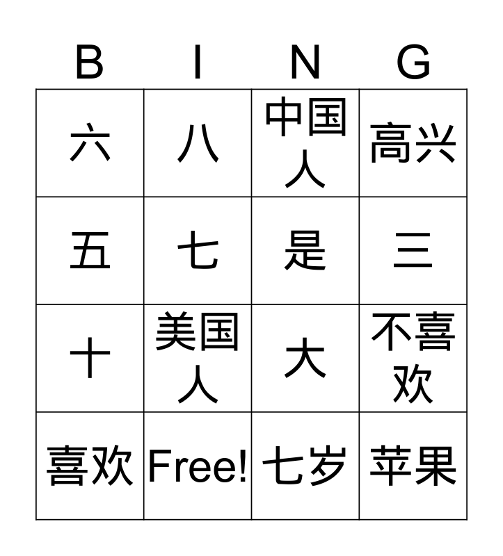 This bingo card has 25 words: 一, 二, 三, 四, 五, 六, 七, 八, Free!, 九, 十, 大, 小, 也, 是, 叫, 七岁, 中国人, 美国人, 不喜欢, 喜欢, 一个, 苹果, 高兴 and 快乐.