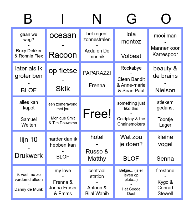 This bingo card has a free space and 24 words: harder dan ik hebben kan - BLOF, my love - Frenna & Jonna Fraser & Emms, PAPARAZZI - Frenna, ik voel me zo verdomd alleen - Danny de Munk, mooi man - Mannenkoor Karrespoor, gaan we weg? - Roxy Dekker & Ronnie Flex, later als ik groter ben - BLOF, oceaan - Racoon, something just like this - Coldplay & the Chainsmokers, hotel - Russo & Matthy, Rockabye - Clean Bandit & Anne-marie & Sean Paul, alles kan kapot - Samuel Welten, Wat zou je doen? - BLOF, kleine vogel - Senna, op fietse - Skik, België... (is er leven op pluto...) - Het Goede Doel, stiekem gedanst - Toontje Lager, het regent zonnestralen - Acda en De munnik, beauty & de brains - Nielson, een zomeravond met jou - Monique Smit & Tim Douwsma, firestone - Kygo & Conrad Stewell, lijn 10 - Drukwerk, lola montez - Volbeat and centraal station - Antoon & Bilal Wahib.