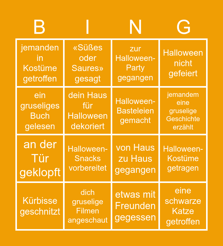 This bingo card has 16 words: dich gruselige Filmen angeschaut, Halloween-Kostüme getragen, zur Halloween-Party gegangen, jemanden in Kostüme getroffen, an der Tür geklopft, «Süßes oder Saures» gesagt, von Haus zu Haus gegangen, etwas mit Freunden gegessen, ein gruseliges Buch gelesen, dein Haus für Halloween dekoriert, Kürbisse geschnitzt, Halloween nicht gefeiert, Halloween-Snacks vorbereitet, jemandem eine gruselige Geschichte erzählt, Halloween-Basteleien gemacht and eine schwarze Katze getroffen.