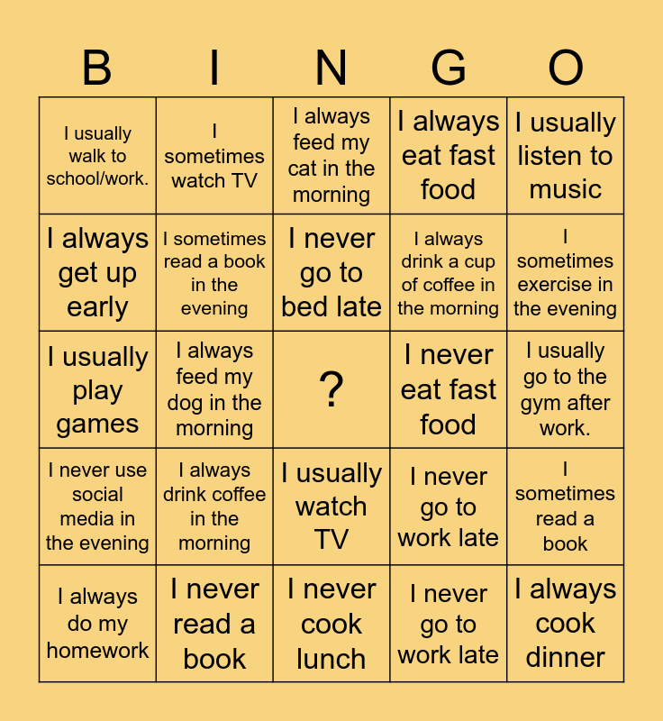 This bingo card has a free space and 24 words: I always drink coffee in the morning, I never read a book, I never go to bed late, I always do my homework, I usually listen to music, I usually walk to school/work., I always get up early, I sometimes watch TV, I never eat fast food, I usually watch TV, I always drink a cup of coffee in the morning, I usually play games, I never go to work late, I sometimes read a book, I sometimes read a book in the evening, I never go to work late, I usually go to the gym after work., I always feed my cat in the morning, I sometimes exercise in the evening, I always feed my dog in the morning, I always cook dinner, I never use social media in the evening, I always eat fast food and I never cook lunch.