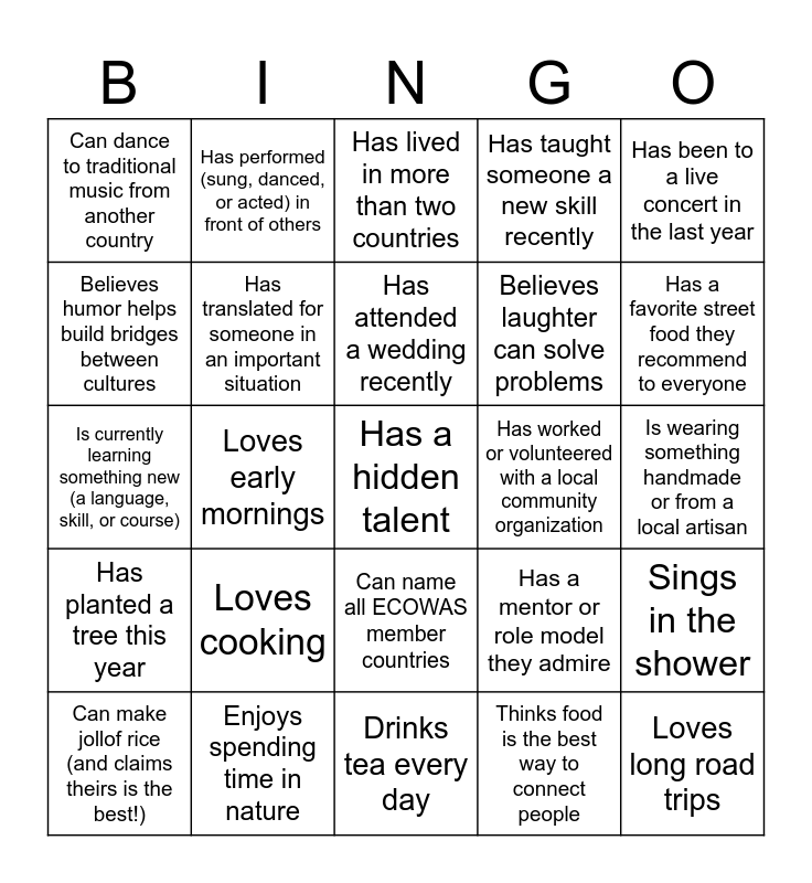 This bingo card has 37 words: Free!, Speaks more than three languages, Can greet someone in at least five different languages, Has translated for someone in an important situation, Sings in the shower, Loves cooking, Has attended a wedding recently, Plays a musical instrument, Has been to a live concert in the last year, Is the oldest child in their family, Loves early mornings, Has taught someone a new skill recently, Has a hidden talent, Is wearing something handmade or from a local artisan, Believes humor helps build bridges between cultures, Has planted a tree this year, Has children, Has lived in more than two countries, Can name all ECOWAS member countries, Has worked or volunteered with a local community organization, Can dance to traditional music from another country, Has a favorite street food they recommend to everyone, Can make jollof rice (and claims theirs is the best!), Drinks tea every day, Loves spicy food, Thinks food is the best way to connect people, Has performed (sung, danced, or acted) in front of others, Can name three famous African musicians, Likes writing, painting, or another creative hobby, Is usually the first to start a conversation, Is a good storyteller, Enjoys spending time in nature, Is currently learning something new (a language, skill, or course), Loves long road trips, Has a mentor or role model they admire, Believes laughter can solve problems and Believes teamwork makes everything easier.