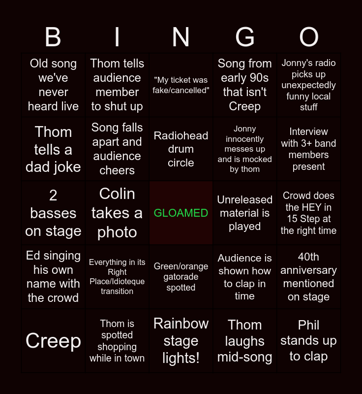 This bingo card has a free space and 27 words: Audience is shown how to clap in time, Band member speaks local language, Jonny innocently messes up and is mocked by thom, Rainbow stage lights!, Thom tells a dad joke, "My ticket was fake/cancelled", Thom tells audience member to shut up, Ed singing his own name with the crowd, Unreleased material is played, 40th anniversary mentioned on stage, 2 basses on stage, Song from early 90s that isn't Creep, Creep, Thom is spotted shopping while in town, Interview with 3+ band members present, Something new heard during soundcheck, Song falls apart and audience cheers, Radiohead drum circle, Everything in its Right Place/Idioteque transition, Old song we've never heard live, Crowd does the HEY in 15 Step at the right time, Thom laughs mid-song, Colin takes a photo, Phil stands up to clap, Green/orange gatorade spotted, Jonny's radio picks up unexpectedly funny local stuff and Jonny stares at the ceiling.