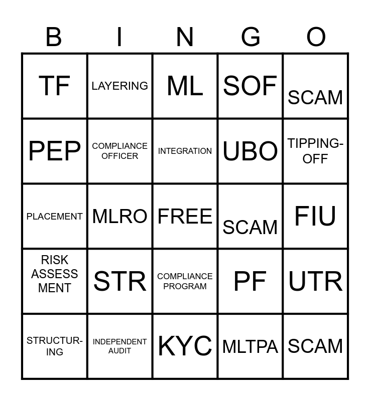 This bingo card has a free space and 24 words: STRUCTUR-ING, STR, INTEGRATION, MLTPA, SCAM, TF, LAYERING, ML, SCAM, FIU, PLACEMENT, COMPLIANCE OFFICER, PF, UTR, PEP, INDEPENDENT AUDIT, KYC, SOF, TIPPING-OFF, RISK ASSESS MENT, MLRO, COMPLIANCE PROGRAM, UBO and SCAM.