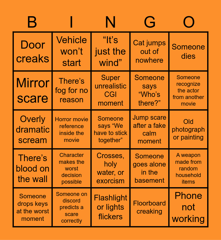 This bingo card has 27 words: Someone goes alone in the basement, Phone not working, Someone says “Who’s there?”, Flashlight or lights flickers, Mirror scare, “It’s just the wind”, Vehicle won’t start, There’s blood on the wall, Jump scare after a fake calm moment, A weapon made from random household items, Overly dramatic scream, Cat jumps out of nowhere, Someone drops keys at the worst moment, Someone on discord predicts a scare correctly, Someone recognize the actor from another movie, Someone screams in discord, There’s fog for no reason, Super unrealistic CGI moment, Character makes the worst decision possible, Door creaks, Old photograph or painting, Floorboard creaking, Horror movie reference inside the movie, Someone says “We have to stick together”, Crosses, holy water, or exorcism, Someone dies and Blonde girl with big tiddies.