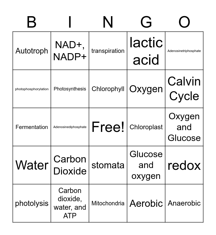 This bingo card has a free space and 29 words: Cellular respiration, Carbon dioxide, water, and ATP, transpiration, Heterotroph, Adenosinetriphosphate, Autotroph, Photosynthesis, Chlorophyll, Chloroplast, redox, photolysis, Adenosinediphosphate, Aerobic, Anaerobic, Fermentation, Sunlight, Mitochondria, Glucose and oxygen, Calvin Cycle, Water, Carbon Dioxide, Glucose, Oxygen, Oxygen and Glucose, photophosphorylation, NAD+, NADP+, stomata, lactic acid and endosymbiotic theory.