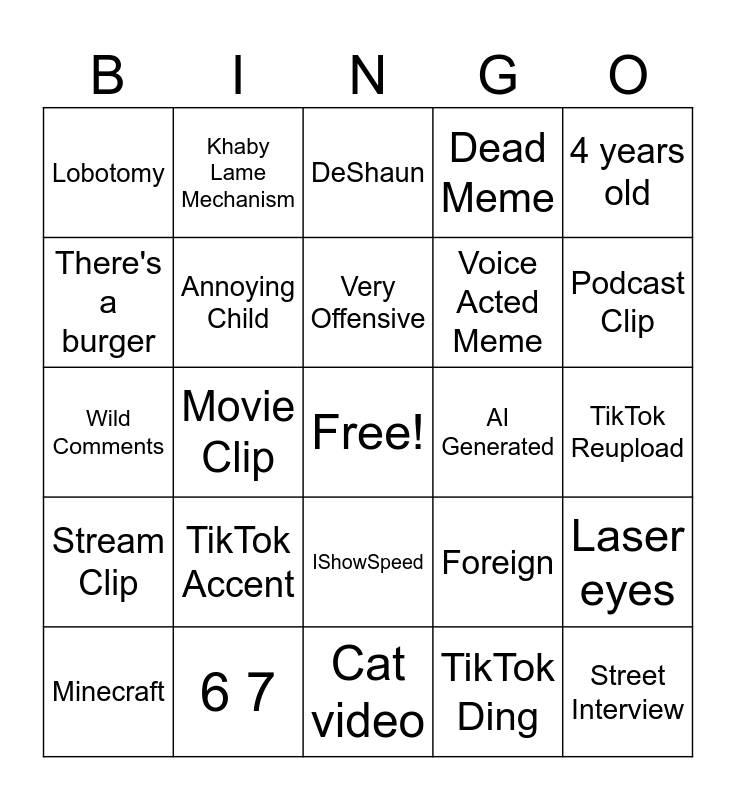 This bingo card has a free space and 24 words: TikTok Accent, 6 7, Very Offensive, Minecraft, 4 years old, Lobotomy, There's a burger, Khaby Lame Mechanism, AI Generated, IShowSpeed, Voice Acted Meme, Wild Comments, Foreign, Laser eyes, Annoying Child, TikTok Ding, TikTok Reupload, DeShaun, Podcast Clip, Movie Clip, Street Interview, Stream Clip, Dead Meme and Cat video.