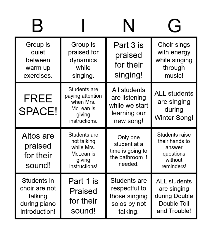 This bingo card has 16 words: Part 1 is Praised for their sound!, Students raise their hands to answer questions without reminders!, Part 3 is praised for their singing!, Group is quiet between warm up exercises., Altos are praised for their sound!, Group is praised for dynamics while singing., Only one student at a time is going to the bathroom if needed., Students are respectful to those singing solos by not talking., FREE SPACE!, Students are paying attention when Mrs. McLean is giving instructions., Students in choir are not talking during piano introduction!, Choir sings with energy while singing through music!, Students are not talking while Mrs. McLean is giving instructions!, ALL students are singing during Winter Song!, All students are listening while we start learning our new song! and ALL students are singing during Double Double Toil and Trouble!.