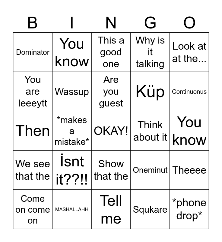 This bingo card has a free space and 24 words: İsnt it??!!, MASHALLAHH, Are you guest, Come on come on, Look at at the..., Dominator, You are leeeytt, You know, Think about it, Show that the, Küp, Then, Oneminut, Theeee, Wassup, Squkare, You know, This a good one, Continuonus, *makes a mistake*, *phone drop*, We see that the, Why is it talking and Tell me.