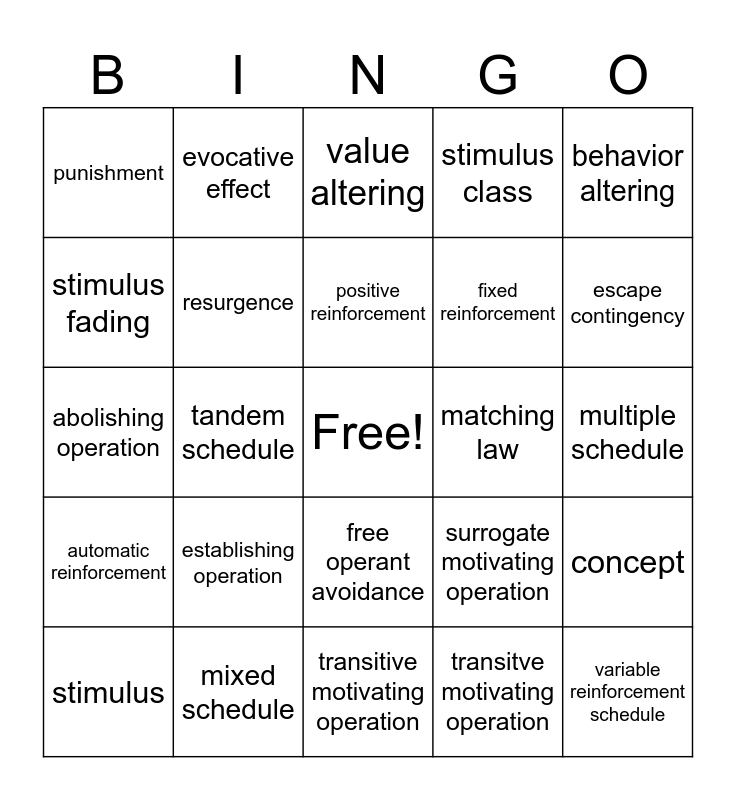 This bingo card has a free space and 24 words: establishing operation, mixed schedule, positive reinforcement, stimulus, behavior altering, punishment, stimulus fading, evocative effect, matching law, free operant avoidance, fixed reinforcement, abolishing operation, surrogate motivating operation, concept, resurgence, transitve motivating operation, multiple schedule, value altering, escape contingency, tandem schedule, variable reinforcement schedule, automatic reinforcement, stimulus class and transitive motivating operation.
