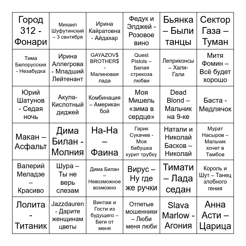 This bingo card has 36 words: Вирус – Ну где же ручки, Дима Билан – Невозможное возможно, Отпетые мошенники – Люби меня люби, Тима Белорусских - Незабудка, Макан – Асфальт, Моя Мишель «зима в сердце», Ирина Аллегрова - Младший Лейтенант, Винтаж и Гости из будущего – Беги от меня, Бьянка – Были танцы, Тимати – Лада седан, Митя Фомин – Всё будет хорошо, Федук и Элджей - Розовое вино, Король и Шут – Танец злобного гения, Акула- Кислотный диджей, Quest Pistols – Белая стрекоза любви, Город 312 - Фонари, Валерий Меладзе – Красиво, Dead Blond – Мальчик на 9-ке, Юрий Шатунов - Седая ночь, Ирина Кайратовна - Айдахар, Комбинация – Американ бой, Дима Билан - Молния, Гарик Сукачев - Моя бабушка курит трубку, На-На – Фаина, Натали и Николай Басков – Николай, Михаил Шуфутинский – 3 сентября, Леприконсы – Хали-Гали, Jazzdauren - Дарите женщинам цветы, GAYAZOV$ BROTHER$ - Малиновая лада, Сектор Газа – Туман, Анна Асти – Царица, Лолита - Титаник, Мурат Насыров – Мальчик хочет в Тамбов, Баста - Медлячок, Шура – Ты не верь слезам and Slava Marlow - Агония.