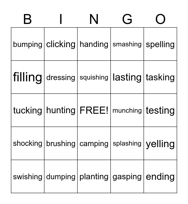 This bingo card has a free space and 24 words: brushing, dumping, squishing, swishing, spelling, bumping, filling, clicking, munching, camping, lasting, tucking, splashing, yelling, dressing, gasping, testing, handing, tasking, hunting, ending, shocking, smashing and planting.