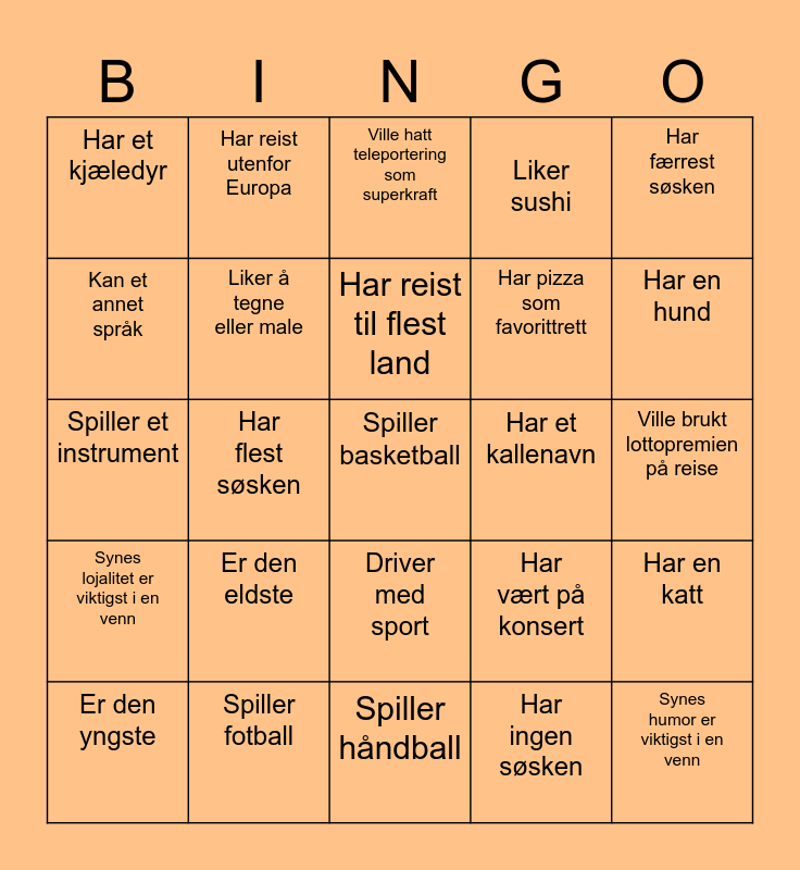 This bingo card has a free space and 24 words: Er den eldste, Spiller fotball, Har reist til flest land, Er den yngste, Har færrest søsken, Har et kjæledyr, Kan et annet språk, Har reist utenfor Europa, Har et kallenavn, Driver med sport, Har pizza som favorittrett, Spiller et instrument, Har vært på konsert, Har en katt, Liker å tegne eller male, Har ingen søsken, Ville brukt lottopremien på reise, Ville hatt teleportering som superkraft, Har en hund, Har flest søsken, Synes humor er viktigst i en venn, Synes lojalitet er viktigst i en venn, Liker sushi and Spiller håndball.