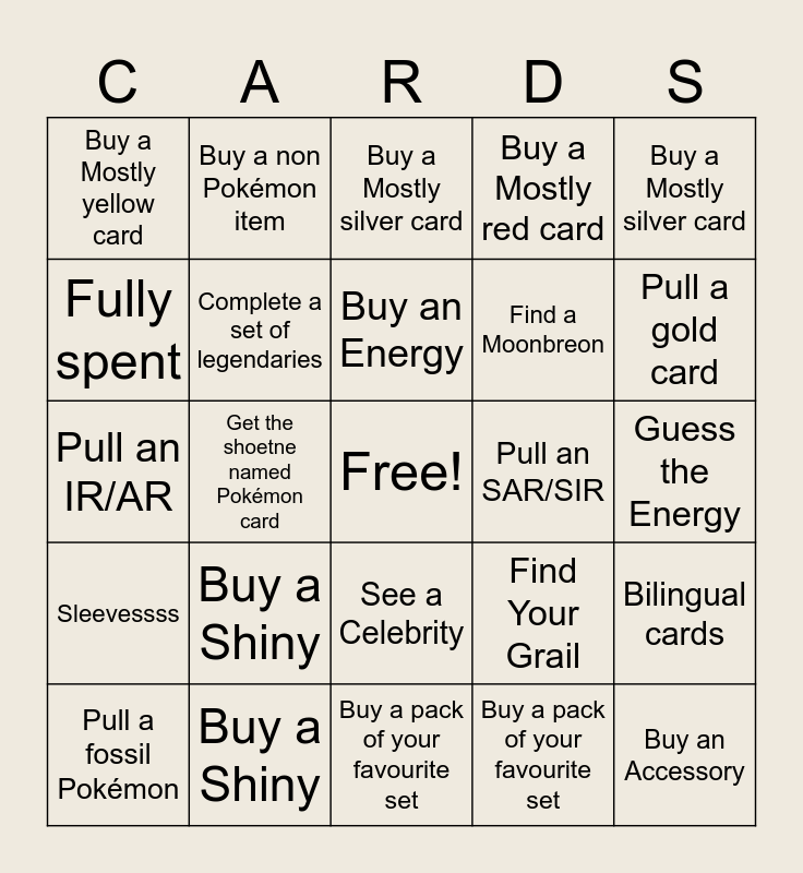 ⚠ This card has duplicate items: Find Your Grail (2), See a Trade Up Challenge (2), See a Celebrity (2), Overpriced Card (2), The Stench (2), Meet a YouTuber (2), Find a Moonbreon (2), Phantasmal Flames Packs (2), Witness a Card Battle (2), Purchase an Eeveelution (2), Buy a Mostly Blue Card (2), Pull an SAR/SIR (2), Purchase a Base Set Card (2), Guess the Energy (2), Buy a Starter (2), Buy an Energy (2), Find Cool Porygon (2), Find a Product worth over 5k (2), Find art cards (2), Buy a Larry Card (2), Complete a Trade (2), Caught on Camera (2), Buy a pack of your favourite set (2), FNAF Combo (buy a chicken, fox, rabbit, bear) (2), Pull an IR/AR (2), Buy a Shiny (2), Buy an Accessory (2), Spend 80% of your budget on one item (2), Base Set Zard (2), Buy a non Pokémon item (2), Complete a set of legendaries (2), Bilingual cards (2), Buy a Jumbo card (2), Sleevessss (2), Buy a Mostly yellow card (2), Buy a Mostly red card (2), Buy a Mostly silver card (2), Buy a spoopy card (2), Get the shoetne named Pokémon card (2), Pull a gold card (2), Pull a fossil Pokémon (2), Fully spent (2), Win a coin flip (2), Pull a Pokémon that can become mega (2), Buy a tin (2)