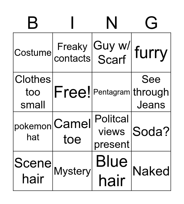 This bingo card has 16 words: Mystery, Soda?, Guy w/ Scarf, Costume, pokemon hat, Freaky contacts, Politcal views present, Blue hair, Clothes too small, Free!, Scene hair, furry, Camel toe, See through Jeans, Pentagram and Naked.