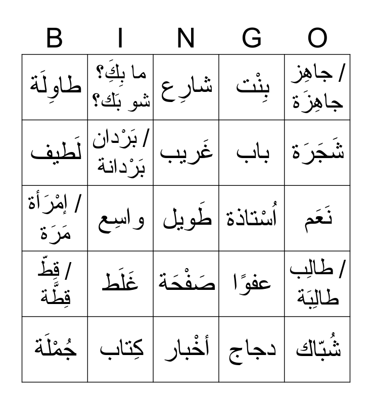 This bingo card has 59 words: Free!, كِتاب, خُبْز / عَيْش, قِطّ / قِطَّة, دجاج, قَهْوَة, بَرْدان / بَرْدانة, صَعِب, باب, قِصَّة, بِنْت, عندي, لَطيف, مُشكِلَة, قَصير/ة, طاوِلَة, طَويل, جاهِز / جاهِزَة, غُرفَة, غَريب, اُسْتاذة, شارِع, جُمْلَة, طالِب / طالِبَة, شاي, عَطْشان / عَطْشانَة, هَذا / هَذِه, تَعْبان / تَعْبانة, شَجَرَة, زعْلان / زعلانة, حِجاب, ساعَة, ماء / ميّ, ما, ما بِكَِ؟ شو بَك؟, أينَ؟, أبْيَض, واسِع, شُبّاك, إمْرَأة / مَرَة, كَلِمَة, غَلَط, نَعَم, تَشْرَب / تَشْرَبين, تَذْهَب / تَذْهَبين, تُحِبّ / تُحبّين, تُريد / تُريدين, ماء / ميّ, صَفْحَة, أخْبار, رَجُل, شو, تُشاهِد / تُشاهدين, إسم, قَلَم, عفوًا, شَباب, شُبّاك and إمْرَأة / مَرَة.