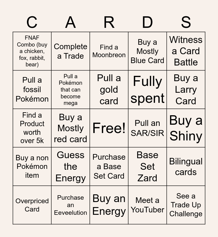 This bingo card has a free space and 45 words: Find Your Grail, See a Trade Up Challenge, See a Celebrity, Overpriced Card, The Stench, Meet a YouTuber, Find a Moonbreon, Phantasmal Flames Packs, Witness a Card Battle, Purchase an Eeveelution, Buy a Mostly Blue Card, Pull an SAR/SIR, Purchase a Base Set Card, Guess the Energy, Buy a Starter, Buy an Energy, Find Cool Porygon, Find a Product worth over 5k, Find art cards, Buy a Larry Card, Complete a Trade, Caught on Camera, Buy a pack of your favourite set, FNAF Combo (buy a chicken, fox, rabbit, bear), Pull an IR/AR, Buy a Shiny, Buy an Accessory, Spend 80% of your budget on one item, Base Set Zard, Buy a non Pokémon item, Complete a set of legendaries, Bilingual cards, Buy a Jumbo card, Sleevessss, Buy a Mostly yellow card, Buy a Mostly red card, Buy a Mostly silver card, Buy a spoopy card, Get the shortest named Pokémon card, Pull a gold card, Pull a fossil Pokémon, Fully spent, Win a coin flip, Pull a Pokémon that can become mega and Buy a tin.