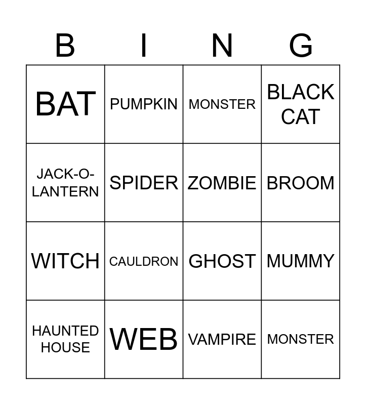 This bingo card has 17 words: VAMPIRE, HAUNTED HOUSE, MONSTER, BAT, CAULDRON, BLACK CAT, MUMMY, ZOMBIE, BROOM, SPIDER, WEB, GHOST, JACK-O-LANTERN, PUMPKIN, WITCH, SKELETON and MONSTER.