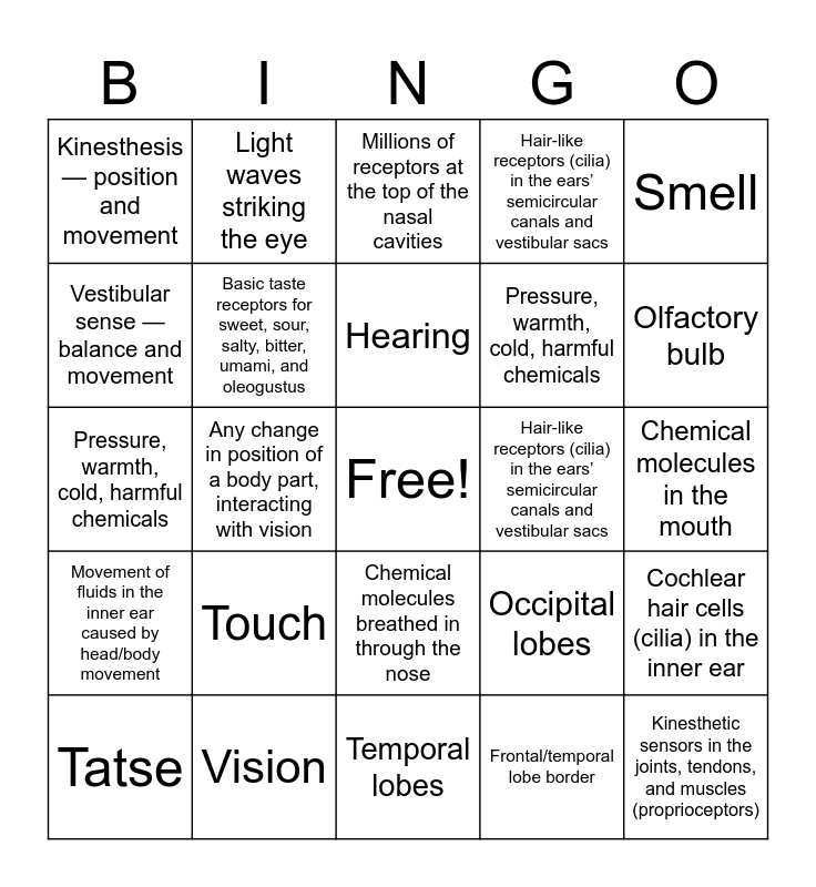 This bingo card has a free space and 24 words: Touch, Vision, Hearing, Tatse, Smell, Kinesthesis — position and movement, Vestibular sense — balance and movement, Light waves striking the eye, Hair-like receptors (cilia) in the ears’ semicircular canals and vestibular sacs, Chemical molecules breathed in through the nose, Pressure, warmth, cold, harmful chemicals, Pressure, warmth, cold, harmful chemicals, Occipital lobes, Cochlear hair cells (cilia) in the inner ear, Basic taste receptors for sweet, sour, salty, bitter, umami, and oleogustus, Frontal/temporal lobe border, Chemical molecules in the mouth, Millions of receptors at the top of the nasal cavities, Olfactory bulb, Any change in position of a body part, interacting with vision, Kinesthetic sensors in the joints, tendons, and muscles (proprioceptors), Movement of fluids in the inner ear caused by head/body movement, Hair-like receptors (cilia) in the ears’ semicircular canals and vestibular sacs and Temporal lobes.