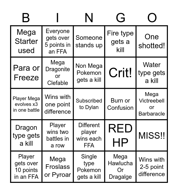 This bingo card has a free space and 24 words: Player wins two battles in a row, Mega Froslass or Pyroar, Non Mega Pokemon gets a kill, Player gets over 10 points in an FFA, One shotted!, Mega Starter used, Para or Freeze, Everyone gets over 5 points in an FFA, Burn or Confusion, Different player wins each FFA, Crit!, Player Mega evolves x3 in one battle, RED HP, MISS!!, Mega Dragonite or Clefable, Mega Hawlucha Or Dragalge, Mega Victreebell or Barbaracle, Someone stands up, Water type gets a kill, Wins with one point difference, Wins with 2-5 point difference, Dragon type gets a kill, Fire type gets a kill and Single type Pokemon gets a kill.