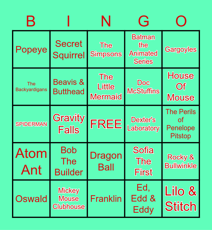 This bingo card has a free space and 109 words: Animaniacs, The Flintstones, Dexter's Laboratory, The Jetsons, Tiny Toon Adventures, The Powerpuff Girls, Looney Tunes, Scooby Doo, Johnny Bravo, Dora The Explorer, Rugrats, Courage The Cowardly Dog, Samurai Jack, Duck Tales, Pinky & The Brain, Ren & Stimpy, SPIDERMAN, Batman Beyond, Darkwing Duck, Johnny Quest, Rocky & Bullwinkle, Cow and Chicken, The Sylvester & Tweety Show, Doug, Goof Troop, The Little Mermaid, Gargoyles, Recess, PB & J, Rolie Polie Olie, House Of Mouse, Batman the Animated Series, The Simpsons, Kim Possible, JoJo's Circus, Lilo & Stitch, Higglytown Heroes, Little Einsteins, Mickey Mouse Clubhouse, Handy Manny, Phineas & Ferb, Special Agent Oso, Doc McStuffins, Gravity Falls, Sofia The First, Super Friends, Chip N Dale, Billy & Mandy, Rick & Morty, Cyberchase, Adventure Time, Teen Titans Go!, Ed, Edd & Eddy, Fosters Home For Imaginary Friends, Camp Lazlo, Ben 10, Chowder, Regular Show, Daria, Beavis & Butthead, Popeye, Pokemon, Speed Racer, Prince Planet, Alvin & the Chipmunks, Reboot, My Little Pony, Rocko's Modern Life, Yogi Bear, Bugs Bunny, The Pink Panther, Secret Squirrel, Atom Ant, Kick Buttowski, Tom & Jerry, Wacky Races, The Perils of Penelope Pitstop, Magilla Gorilla, Top Cat, Woody Woodpecker, Captain Caveman, The Smurfs, Underdog, Josie & The Pussycats, Dudley Do-Right, George Of The Jungle, Gumby, Max & Ruby, The Backyardigans, PAW Patrol, Wow! Wow! Wubbzy!, Bob The Builder, Arthur, Daniel Tiger's Neighborhood, Bubble Guppies, Curious George, Jakers! The Adventures of Piggly Wiggly, Peppa Pig, Franklin, Dragon Tales, The Bernstein Bears, Blue's Clues, Oswald, Dragon Ball, Kipper, Hong Kong Phooey, Thundercats, The Mighty B! and Transformers.