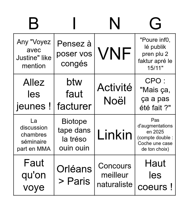 This bingo card has 16 words: Orléans > Paris, Pas d'augmentations en 2025 (compte double : Coche une case de ton choix), VNF, Any "Voyez avec Justine" like mention, La discussion chambres séminaire part en MMA, Pensez à poser vos congés, Linkin, Concours meilleur naturaliste, Allez les jeunes !, btw faut facturer, Faut qu'on voye, "Poure inf0, lé publik pren plu 2 faktur apré le 15/11", Biotope tape dans la tréso ouin ouin, CPO : "Mais ça, ça a pas été fait ?", Activité Noël and Haut les coeurs !.
