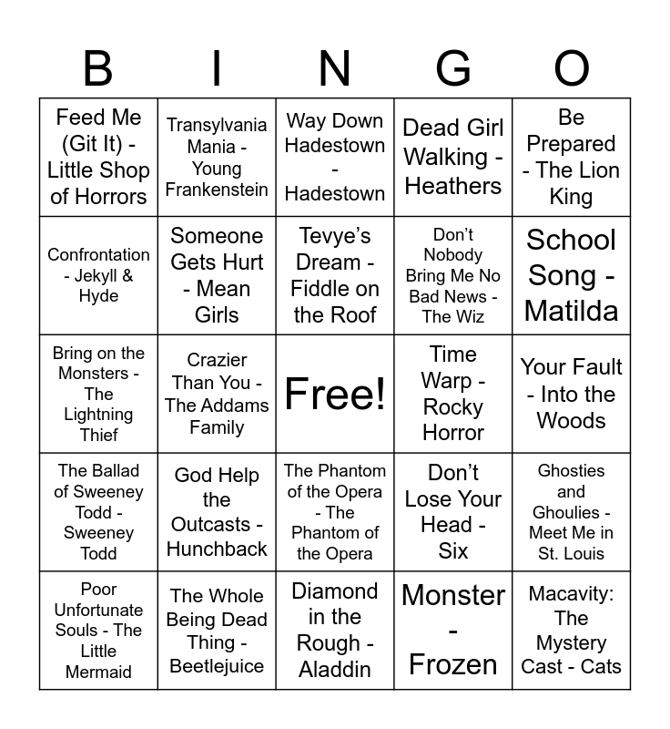 This bingo card has a free space and 30 words: The Whole Being Dead Thing - Beetlejuice, When You’re an Addams - The Addams Family, Crazier Than You - The Addams Family, Prologue - Little Shop of Horrors, Feed Me (Git It) - Little Shop of Horrors, Way Down Hadestown - Hadestown, Someone Gets Hurt - Mean Girls, The Phantom of the Opera - The Phantom of the Opera, Time Warp - Rocky Horror, Diamond in the Rough - Aladdin, Your Fault - Into the Woods, Macavity: The Mystery Cast - Cats, Monster - Frozen, Blood in the Water - Legally Blonde, School Song - Matilda, Magic to Do - Pippin, Don’t Lose Your Head - Six, The Ballad of Sweeney Todd - Sweeney Todd, God Help the Outcasts - Hunchback, Be Prepared - The Lion King, Bring on the Monsters - The Lightning Thief, No Good Deed - Wicked, Transylvania Mania - Young Frankenstein, Don’t Nobody Bring Me No Bad News - The Wiz, Confrontation - Jekyll & Hyde, Dead Girl Walking - Heathers, Ghosties and Ghoulies - Meet Me in St. Louis, Poor Unfortunate Souls - The Little Mermaid, Tevye’s Dream - Fiddle on the Roof and Maison De Lunes - Beauty and the Beast.