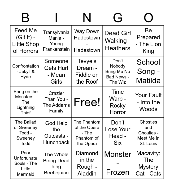 This bingo card has a free space and 30 words: The Whole Being Dead Thing - Beetlejuice, When You’re an Addams - The Addams Family, Crazier Than You - The Addams Family, Prologue - Little Shop of Horrors, Feed Me (Git It) - Little Shop of Horrors, Way Down Hadestown - Hadestown, Someone Gets Hurt - Mean Girls, The Phantom of the Opera - The Phantom of the Opera, Time Warp - Rocky Horror, Diamond in the Rough - Aladdin, Your Fault - Into the Woods, Macavity: The Mystery Cat - Cats, Monster - Frozen, Blood in the Water - Legally Blonde, School Song - Matilda, Magic to Do - Pippin, Don’t Lose Your Head - Six, The Ballad of Sweeney Todd - Sweeney Todd, God Help the Outcasts - Hunchback, Be Prepared - The Lion King, Bring on the Monsters - The Lightning Thief, No Good Deed - Wicked, Transylvania Mania - Young Frankenstein, Don’t Nobody Bring Me No Bad News - The Wiz, Confrontation - Jekyll & Hyde, Dead Girl Walking - Heathers, Ghosties and Ghoulies - Meet Me in St. Louis, Poor Unfortunate Souls - The Little Mermaid, Tevye’s Dream - Fiddle on the Roof and Maison De Lunes - Beauty and the Beast.