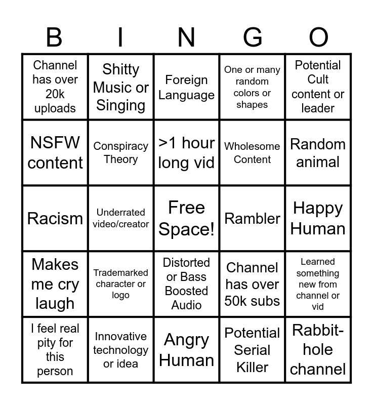 This bingo card has a free space and 24 words: Trademarked character or logo, Innovative technology or idea, >1 hour long vid, I feel real pity for this person, Potential Cult content or leader, Channel has over 20k uploads, NSFW content, Shitty Music or Singing, Rambler, Distorted or Bass Boosted Audio, Wholesome Content, Racism, Channel has over 50k subs, Learned something new from channel or vid, Conspiracy Theory, Potential Serial Killer, Happy Human, Foreign Language, Random animal, Underrated video/creator, Rabbit-hole channel, Makes me cry laugh, One or many random colors or shapes and Angry Human.