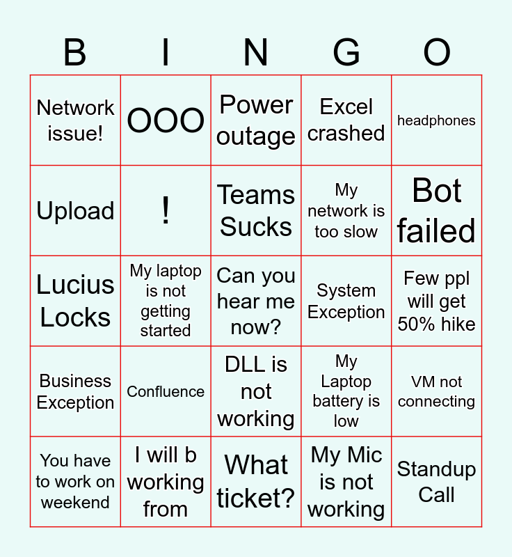 This bingo card has 70 words: This year no appraisal??, Few ppl will get 50% hike, Are you able to hear me, have you received amazon voucher, I will b working from, I m coming to office tomorrow, Excel crashed, Laptop not working, headphones, Run time error, VM not connecting, Are you able to see my screen?, Network issue!, Power outage, mouse not working, My laptop is not getting started, DLL is not working, My network is too slow, Sorry i was speaking in Mute, Business Exception, System Exception, My Laptop battery is low, Bot failed, MS Teams is very slow, There is a bug in the code, Bagles, You are speaking in mute, That sounds great, My Mic is not working, Weekend ON-Call, OOO, No items in Queue, Resource not available, Development completed, UAT is in Progress, Project status, Print this!, Sharepoint, Mandatory trainings, Upload, Standup Call, Confluence, Can you hear me now?, Drop me a email, Is this spam?, !, You have to work on weekend, project kick off call, Team Meeting, Demo, Project Timeline, Application issue, Microservices, Birthday cake, What ticket?, You scanned her where?, Teams Sucks, There's only 8 tickets 7 years old, Its a telecom issue, Scam Likely, Lucius Locks, Together Mode, Zoom this, Rain, Beard, New Girl, WFO, WFH, Team Lunch and Not Audible.