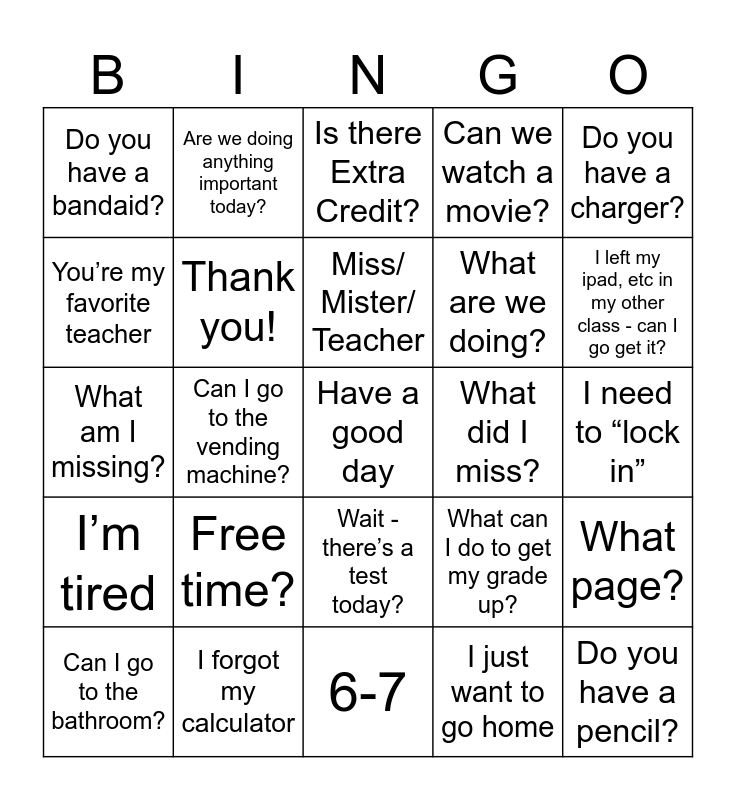 This bingo card has 25 words: Free time?, 6-7, Miss/ Mister/ Teacher, Can I go to the bathroom?, Do you have a charger?, Do you have a bandaid?, You’re my favorite teacher, Are we doing anything important today?, What did I miss?, Wait - there’s a test today?, What are we doing?, What am I missing?, What can I do to get my grade up?, What page?, Thank you!, Do you have a pencil?, I need to “lock in”, Is there Extra Credit?, I left my ipad, etc in my other class - can I go get it?, Can I go to the vending machine?, Have a good day, I forgot my calculator, I’m tired, Can we watch a movie? and I just want to go home.