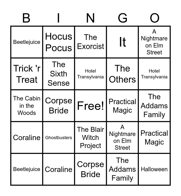 ⚠ This card has duplicate items: Hocus Pocus (2), Halloween (2), The Nightmare Before Christmas (2), Beetlejuice (2), Scream (2), The Addams Family (2), The Exorcist (2), Friday the 13th (2), A Nightmare on Elm Street (2), Coraline (2), It (2), Practical Magic (2), The Blair Witch Project (2), Ghostbusters (2), The Conjuring (2), Corpse Bride (2), Monster House (2), The Cabin in the Woods (2), Hereditary (2), Hotel Transylvania (2)