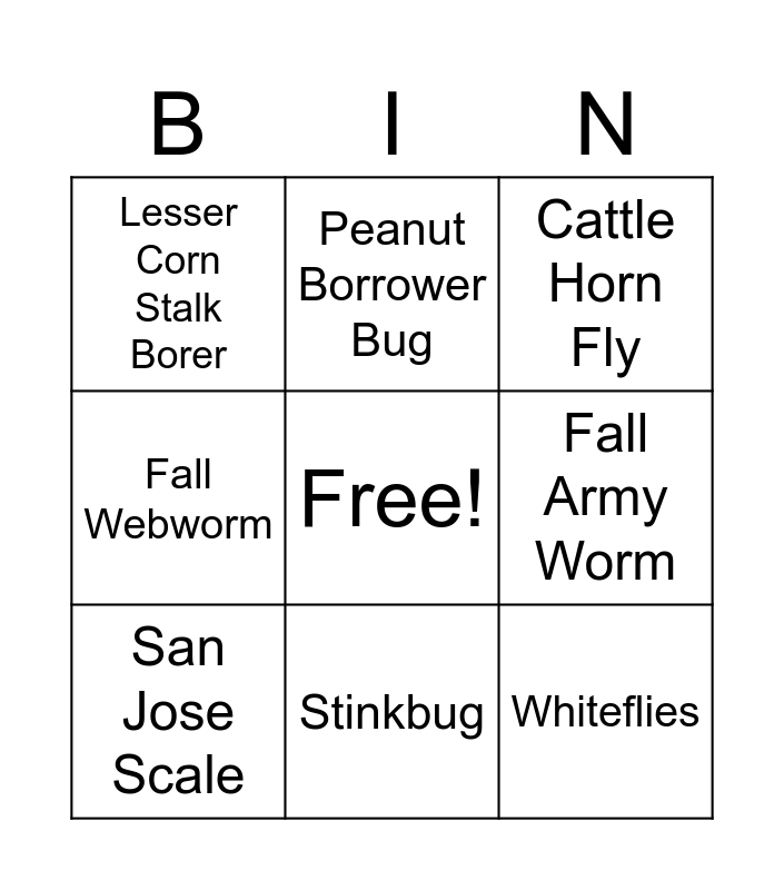This bingo card has a free space and 8 words: Fall Army Worm, Cattle Horn Fly, Peanut Borrower Bug, San Jose Scale, Lesser Corn Stalk Borer, Whiteflies, Fall Webworm and Stinkbug.
