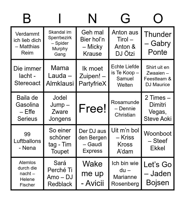 This bingo card has a free space and 40 words: Auffe aufn Berg – Jägermeister Dj Alex, Baila de Gasolina – Effe Serieus, Johnny Däpp – Lorenz Büffel, Mama Lauda – Almklausi, Sará Perché Ti Amo – DJ Redblack, Der DJ aus den Bergen – Gaudi Express, Ik moet Zuipen! – PartyfrieX, Terug in de Tijd – Yves Berendse, Thunder – Gabry Ponte, 99 Luftballons - Nena, Jodel Jump – Zware Jongens, Anton aus Tirol – Anton & DJ Ötzi, Let’s Go – Jaden Bojsen, 2 Times – Dimitri Vegas, Steve Aoki, Rosamunde – Dennie Christian, So einer schöner tag - Tim Toupet, Ik heb de hele nacht – Wolter Kroes, Verdammt ich lieb dich – Matthias Reim, Wackelcontact – Oimara, Geh mal Bier hol’n – Micky Krause, Woonboot – Steef Ekkel, Ich bin wie du – Marianne Rosenberg, Echte Liefde is Te Koop – Samuel Welten, Die immer lacht - Stereoact, Johnny Däpp – Lorenz Büffel, Hey wir wollen die Eisbären sehen – Sound Convoy, Ferry de Roze Flamingo – Barry Fest & Tim Schalkx, Why tell me why – Anita Meyer, Cowboys en Indianen – Dikdakkers, I love you baby – Ferry de Lits, Zij weet het – Tino Martin, Atemlos durch die nacht – Helene Fischer, Engelbewaarder – Marco Schuitenmaker, Uit m’n bol – Kriss Kross A’dam, Shirt uit en Zwaaien – Feestteam & DJ Maurice, Wake me up - Avicii, Even aan mijn moeder vragen – Bloem, Major Tom – Peter Schilling, Skandal im Sperrbezirk – Spider Murphy Gang and Jouw Blik – John West.