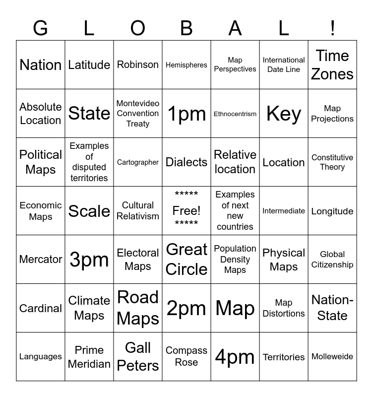 This bingo card has a free space and 48 words: Map, Key, Compass Rose, Scale, Cartographer, Longitude, Latitude, Prime Meridian, International Date Line, Great Circle, Time Zones, Hemispheres, Location, Relative location, Cardinal, Intermediate, Absolute Location, Map Projections, Map Distortions, Map Perspectives, Ethnocentrism, Cultural Relativism, Nation, State, Nation-State, Montevideo Convention Treaty, Constitutive Theory, Languages, Dialects, Examples of disputed territories, Territories, Examples of next new countries, Global Citizenship, Climate Maps, Economic Maps, Population Density Maps, Physical Maps, Political Maps, Electoral Maps, Road Maps, Mercator, Molleweide, Robinson, Gall Peters, 1pm, 2pm, 3pm and 4pm.