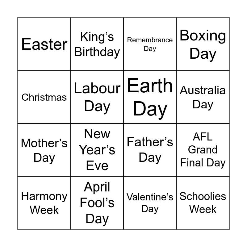 This bingo card has 26 words: Free!, New Year’s Day, Australia Day, Anzac Day, Christmas, Easter, Labour Day, King’s Birthday, Valentine’s Day, Halloween, Mother’s Day, Father’s Day, NAIDOC Week, Pride Month, AFL Grand Final Day, NRL Grand Final Day, Boxing Day, Schoolies Week, Remembrance Day, Harmony Week, New Year’s Eve, Thanksgiving, April Fool’s Day, Black Friday, Earth Day and International Women’s Day.